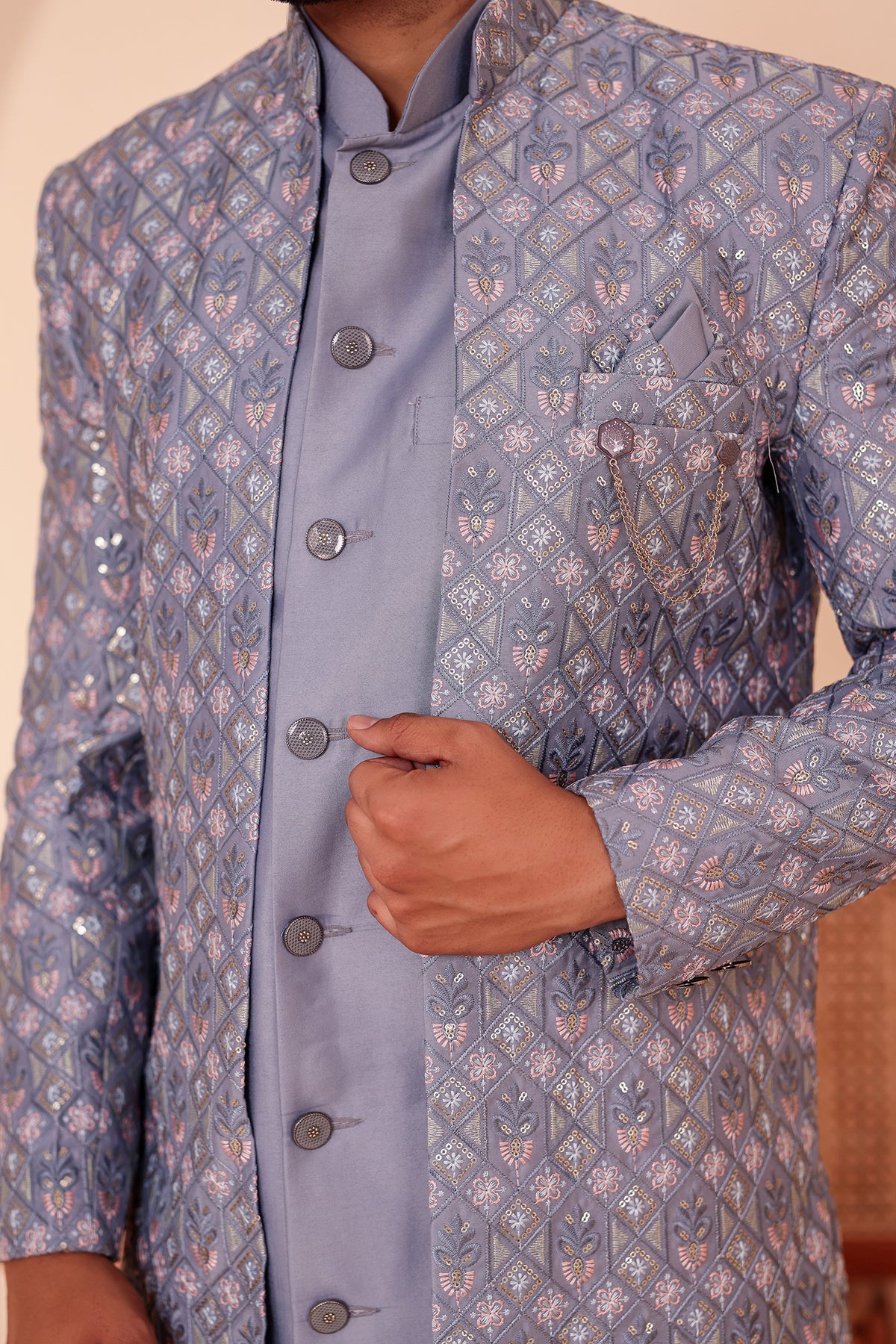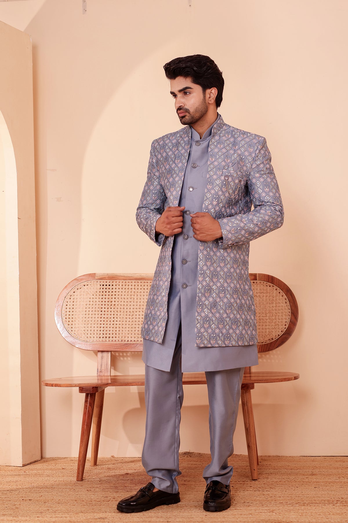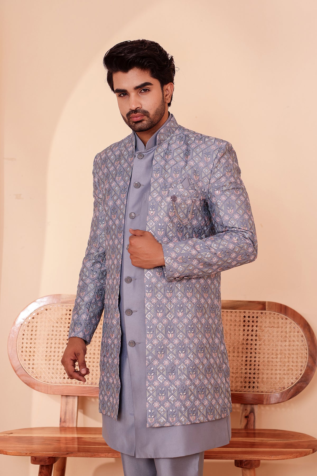 Introducing a striking mesh blue Indo-Western suit that commands attention with its all-over embroidery featuring intricate thread, sequin, and zari detailing. The open jacket style offers contemporary flair whilst maintaining traditional elegance. Versatile enough for weddings, festivals, and formal gatherings, this piece seamlessly transitions across occasions. The breathable mesh fabric ensures comfort without compromising on visual impact, making it an essential addition to any sophisticated wardrobe.