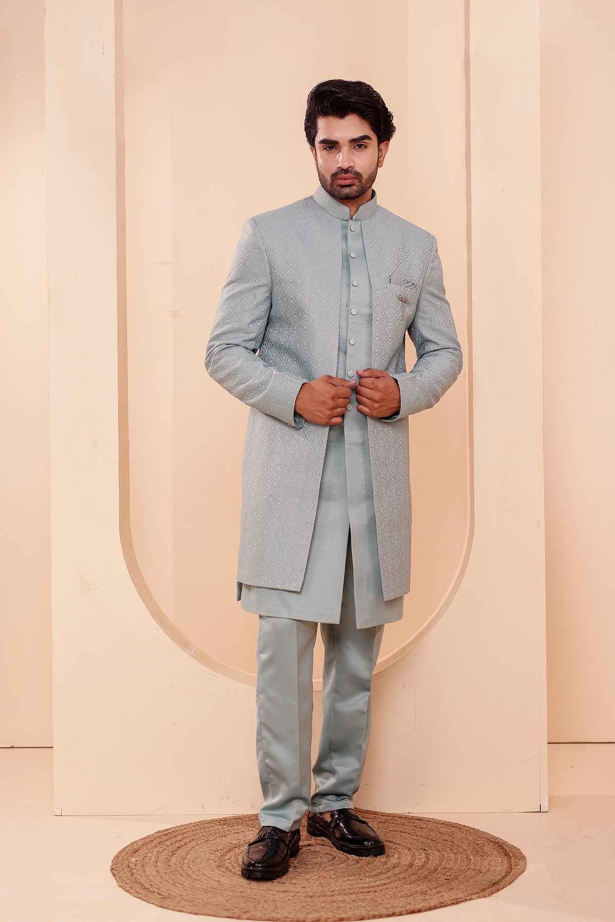 Sage Green Jacquard weave Open Jacket Style Indo-western Suit.