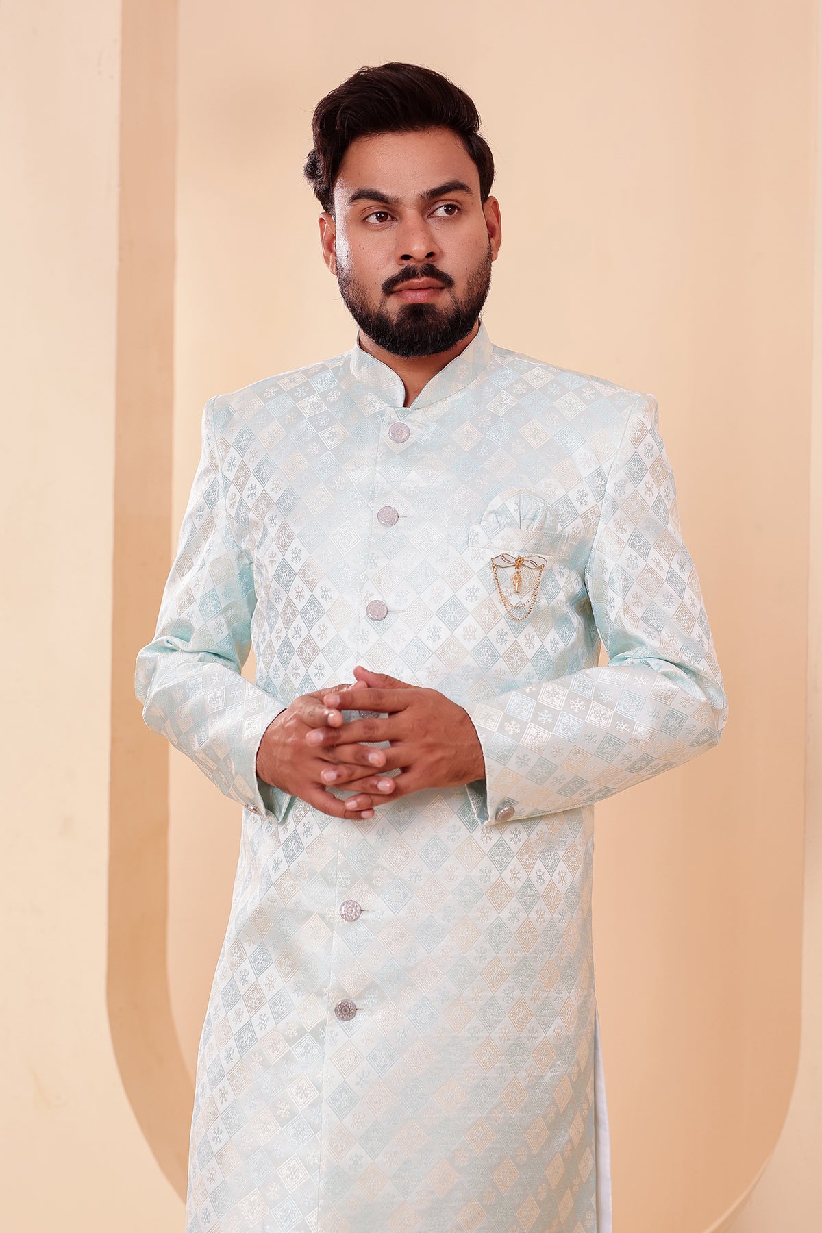 Sea Green Brocade Silk Indo-western Suit, featuring intricate self-thread embroidery in a sleek jacket style. This ensemble exudes elegance and charm, perfect for formal occasions. Elevate your attire with this fusion of traditional craftsmanship and modern design, making a statement wherever you go.