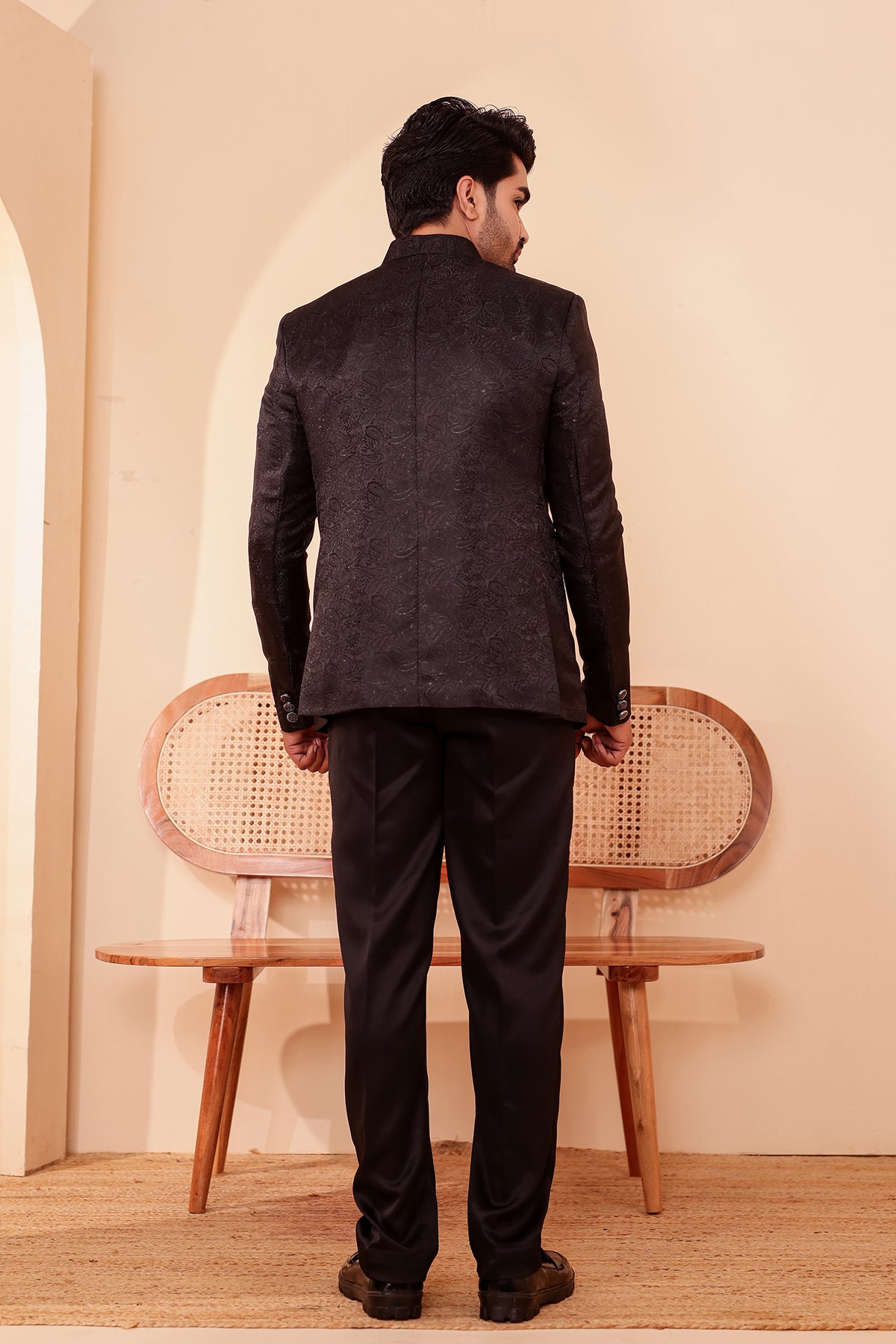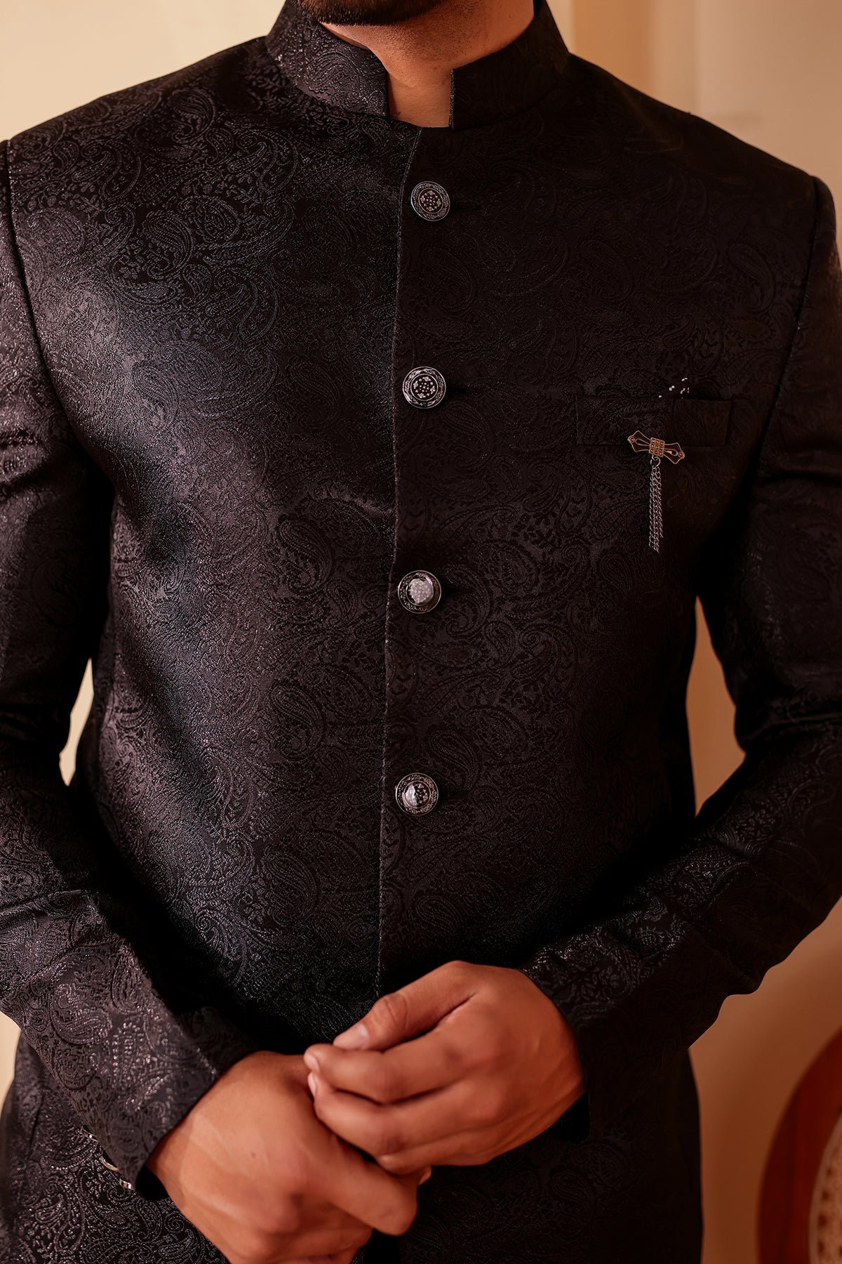 Black Brocade Weave is a sophisticated textile technique, renowned for integrating intricate designs like paisley motifs into fabric. This method creates a fabric that is rich in texture and visual appeal, perfect for crafting elegant and luxurious garments like this Jodhpuri style suit. Brocade is celebrated for its detailed patterns, making it a popular choice for formal wear.