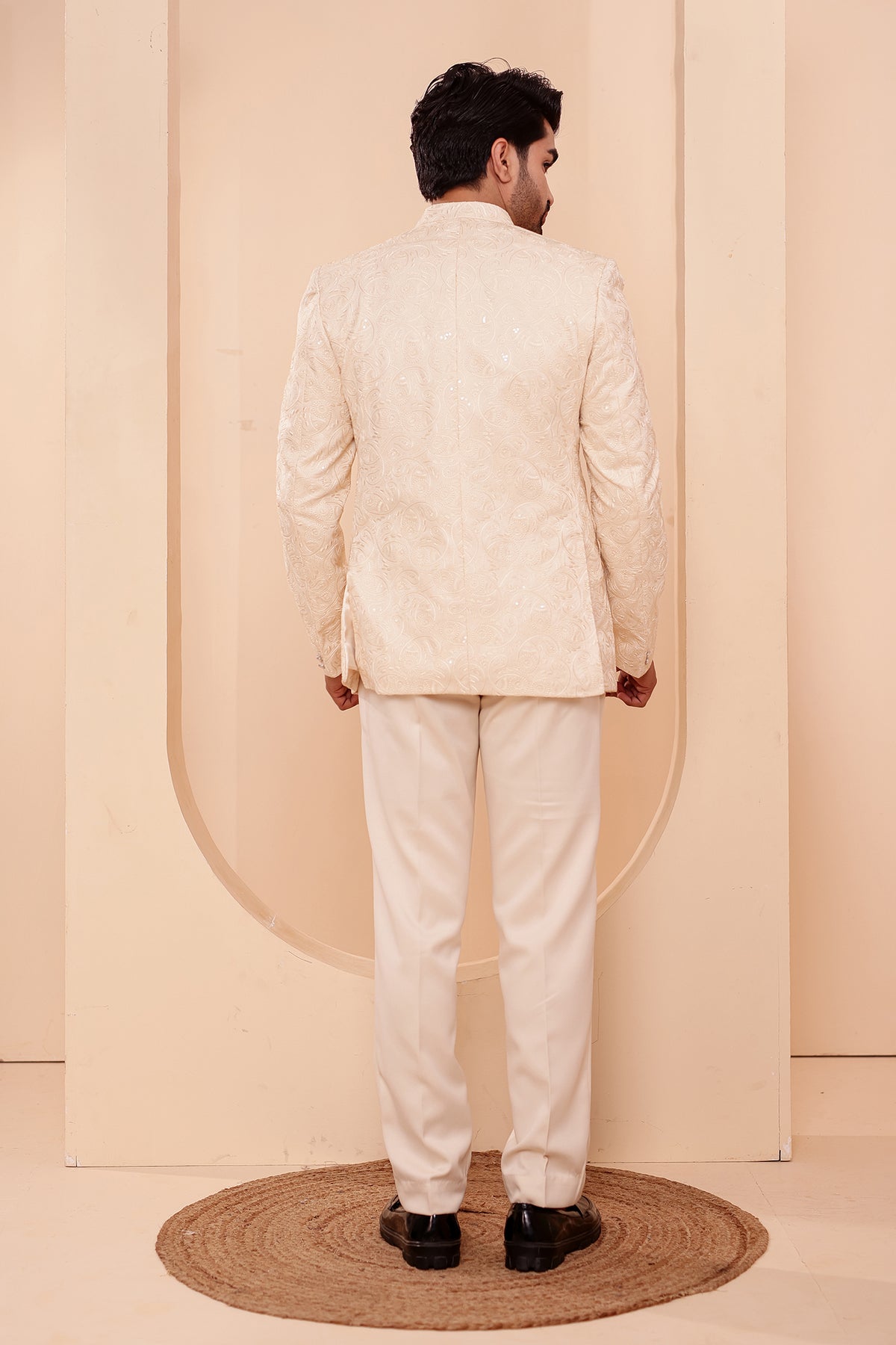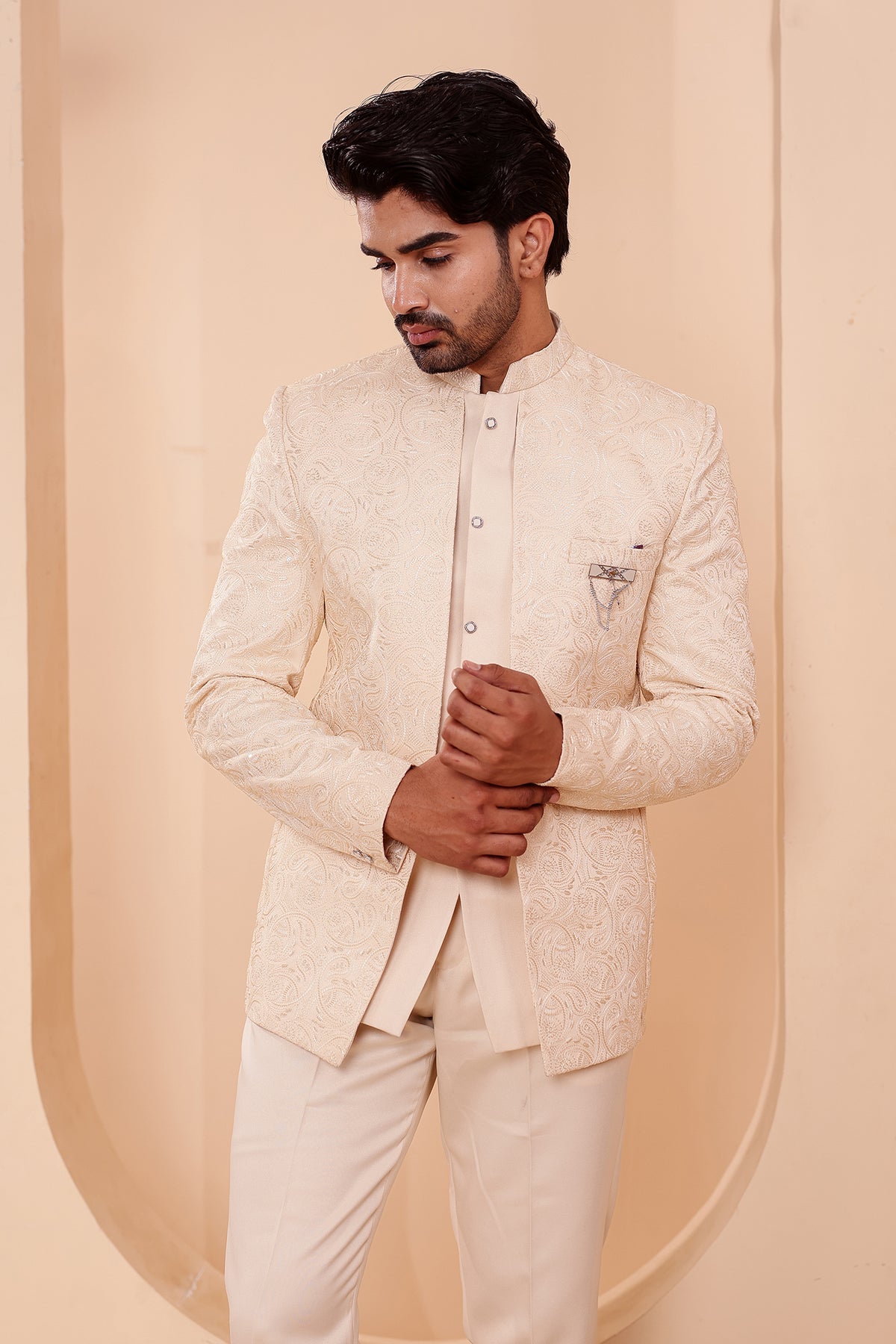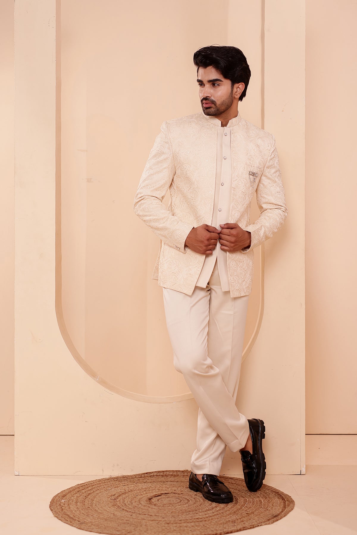 Cream Heavy Embroidered 3pcs Jacket Style Jodhpuri Suit.