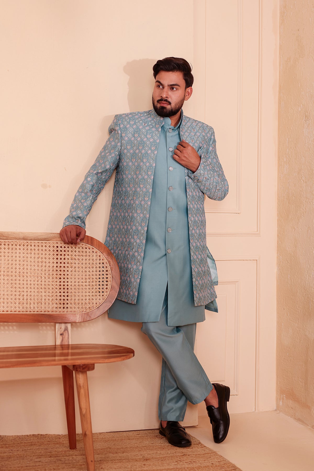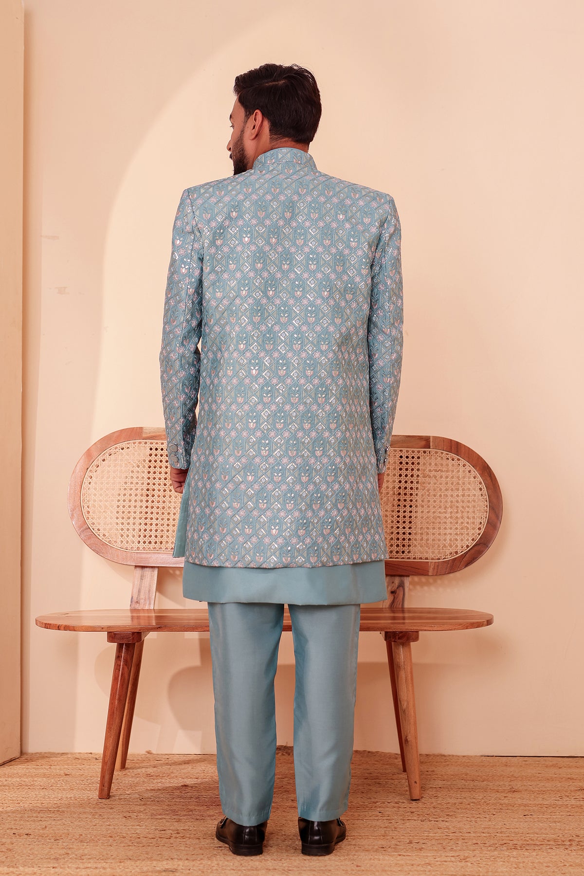 Duck Egg Blue Open Jacket Style Indo-Western Suit Embroidered All over