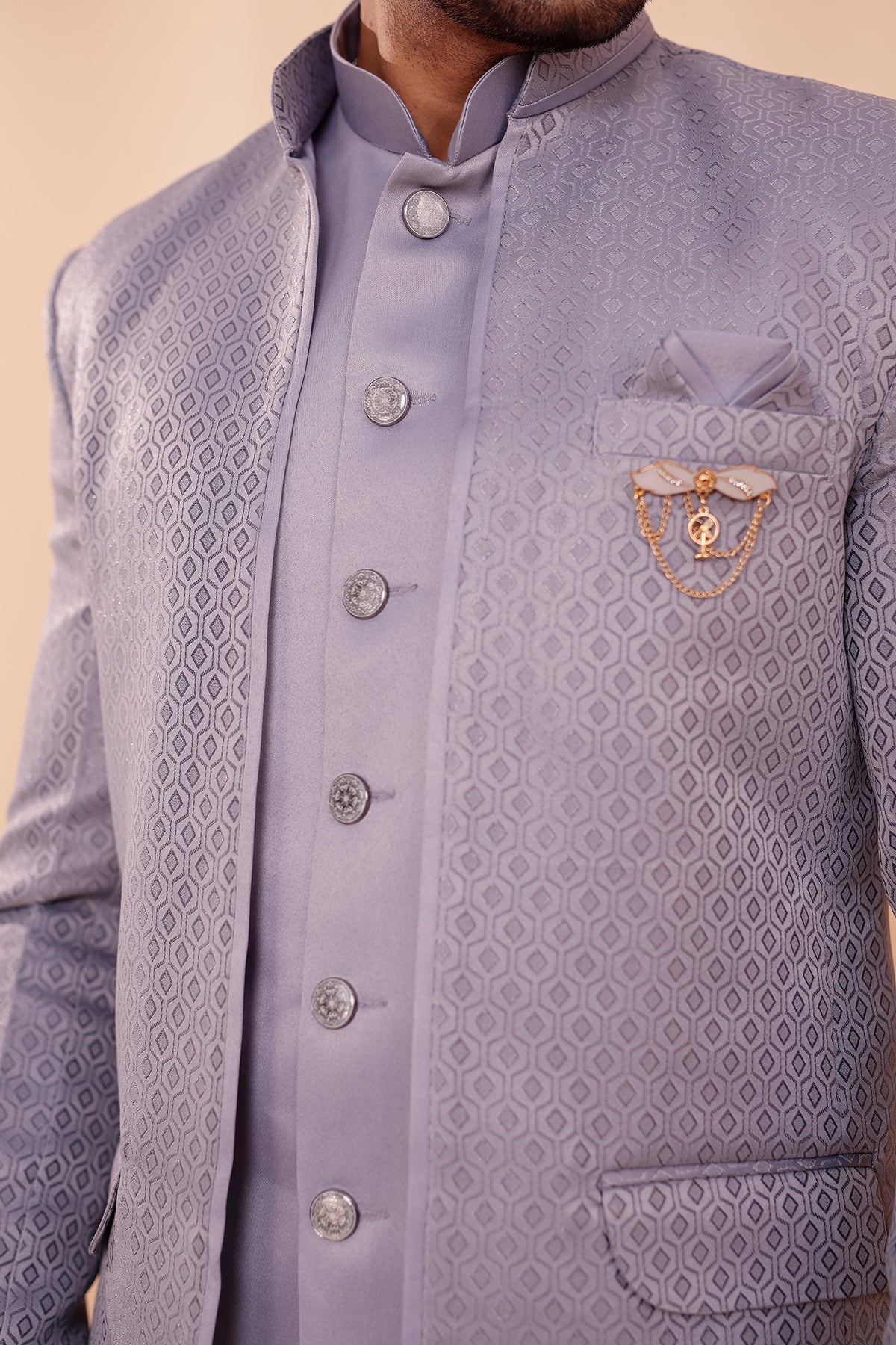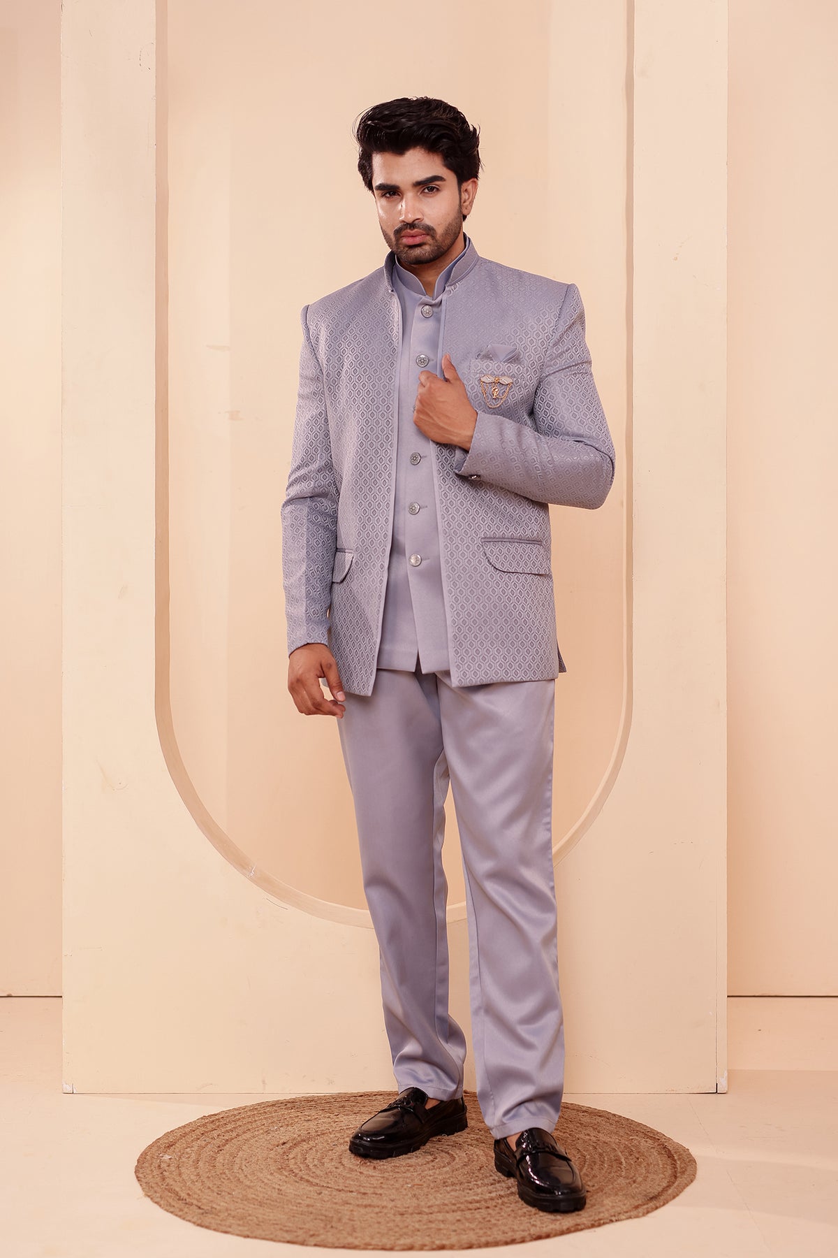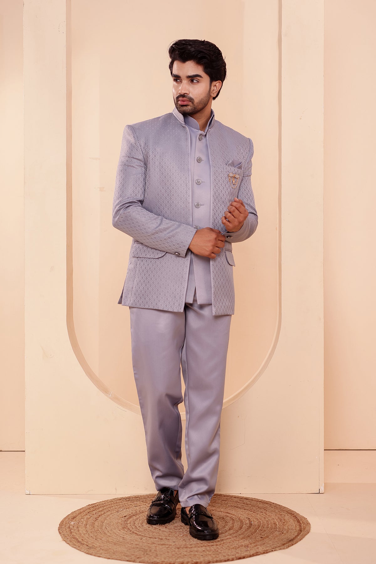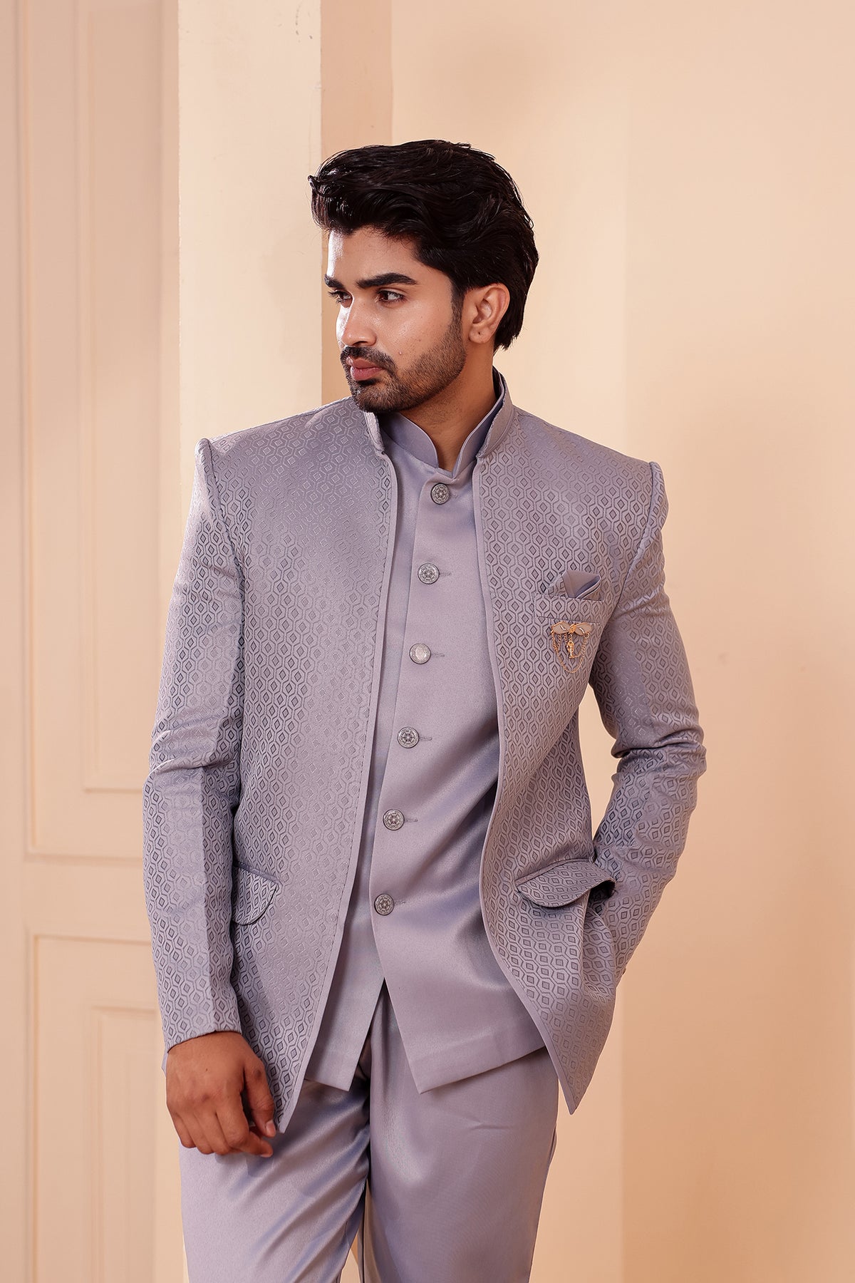 This grey Jodhpuri suit features a modern open-style jacket paired with a matching waistcoat for a layered, regal look. Crafted with a subtle self-textured finish and a sharp mandarin collar, the ensemble is elevated by a refined silver chain brooch and pocket square. It is an ideal choice for a polished, contemporary statement at weddings or formal celebrations.
