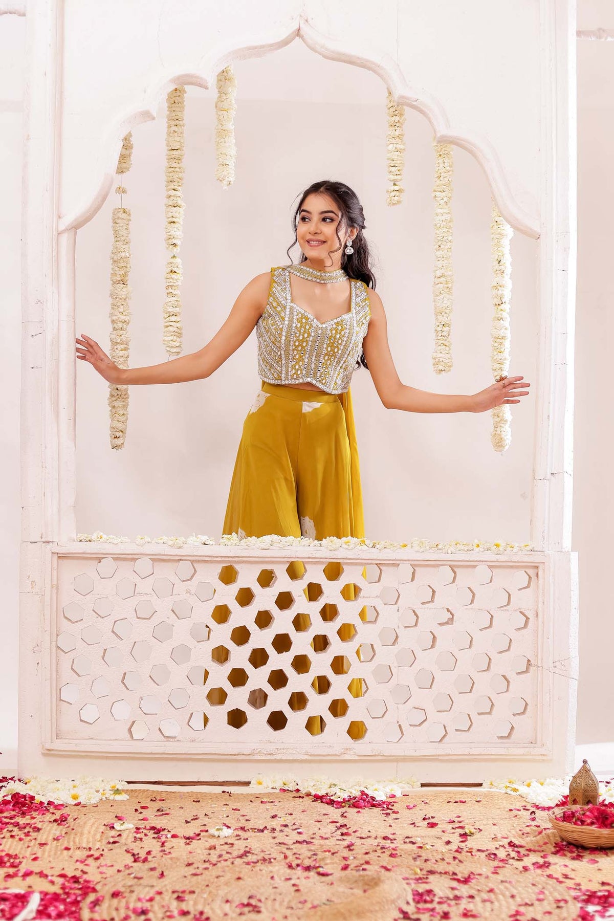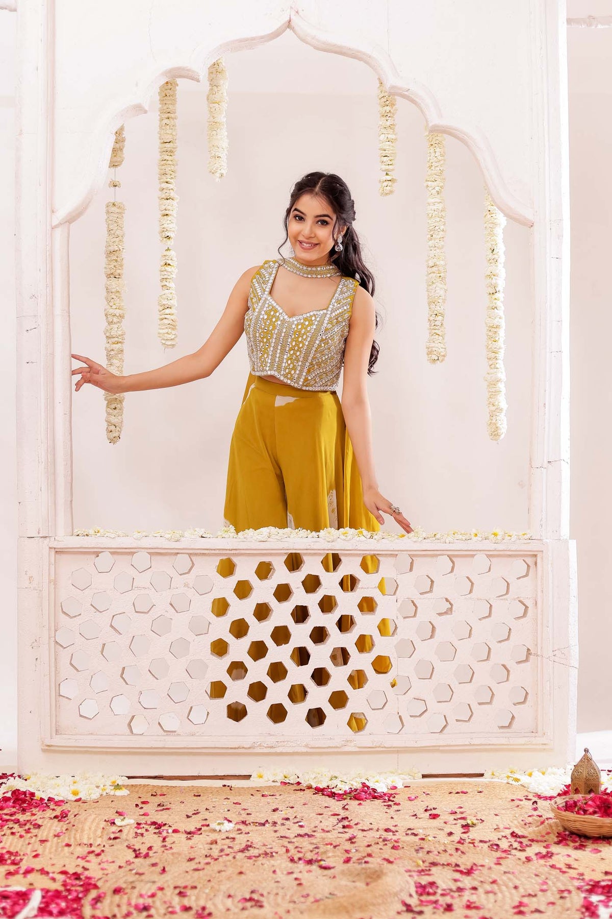 Elevate your celebration wardrobe with this exquisite Mustard lengha choli, crafted from sumptuous soft silk that drapes with effortless grace. The blouse features intricate Lucknowi embroidery, a hallmark of traditional artistry, creating a refined aesthetic that seamlessly transitions from sangeet soirées to wedding festivities and evening gatherings. The harmonious blend of delicate embellishment and luxurious fabric ensures you'll command attention whilst maintaining an air of timeless elegance. Perfect for those who appreciate the marriage of heritage craftsmanship and contemporary sophistication.