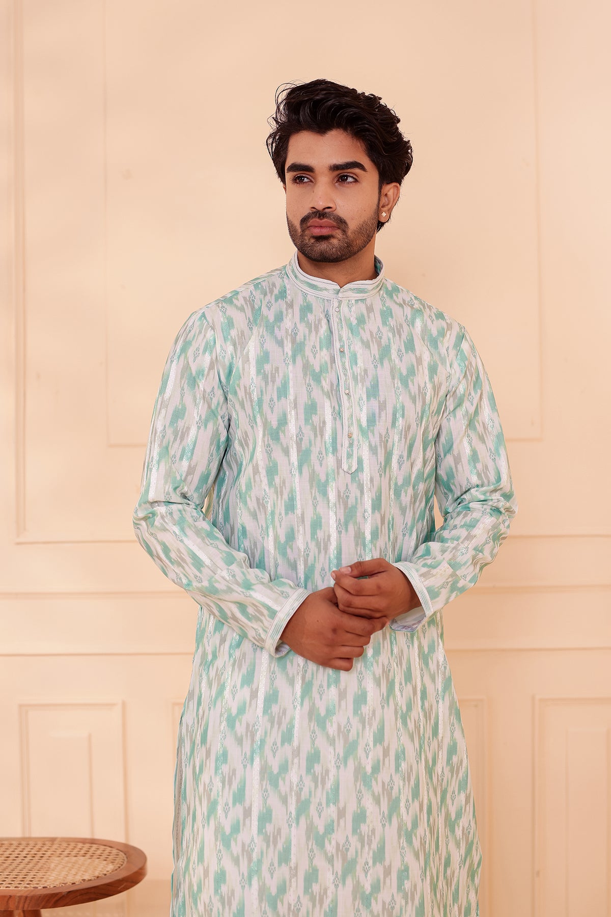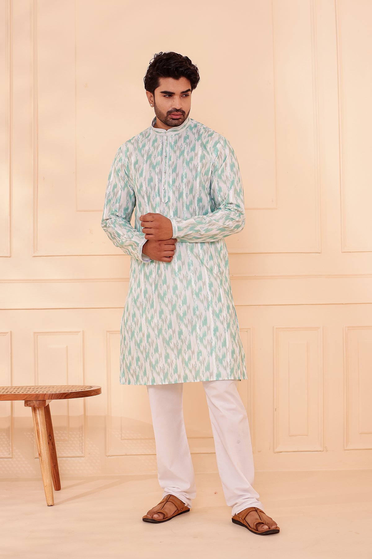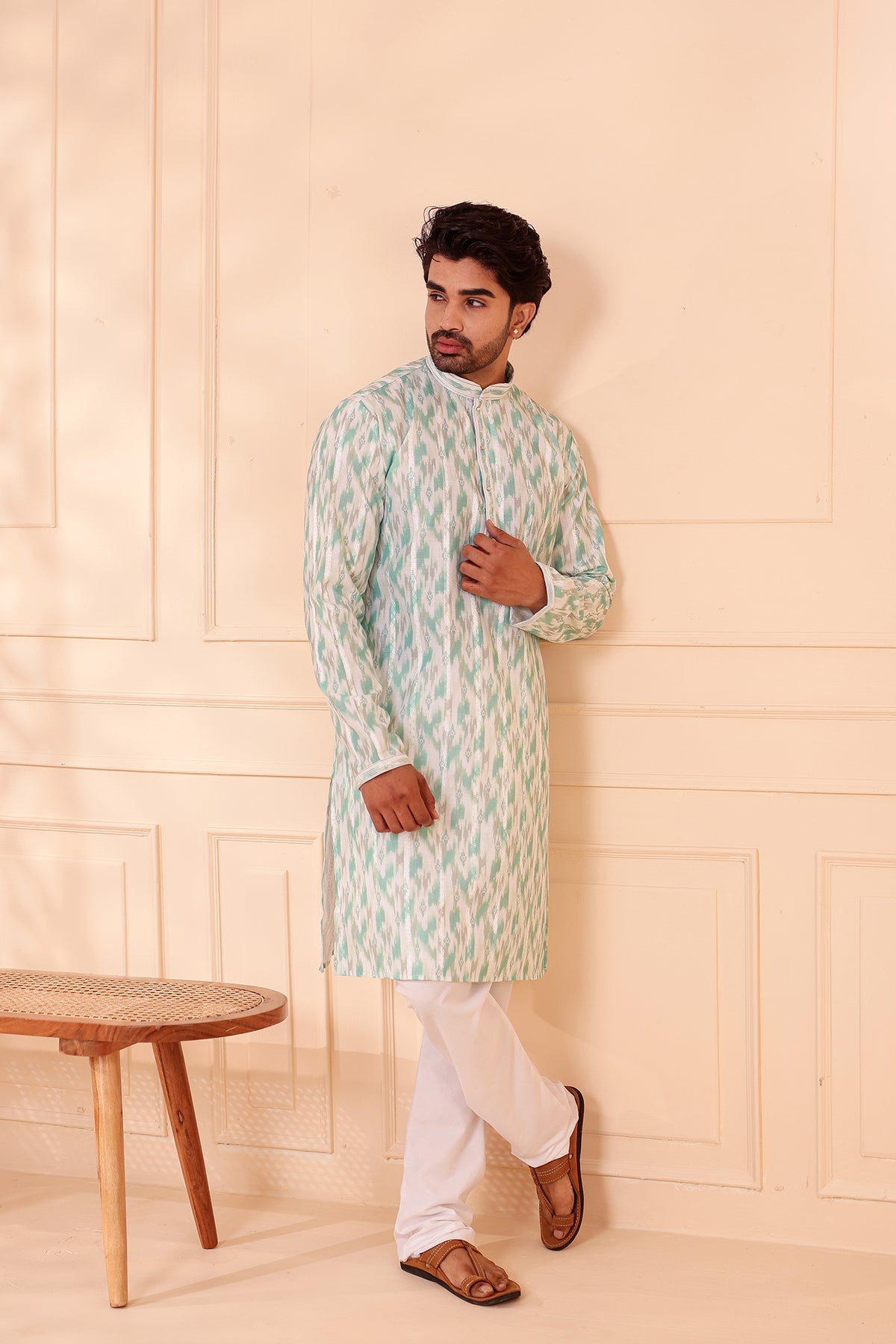 Elevate your wardrobe with this refined Green kurta suit, crafted from sumptuous soft silk adorned with traditional ikat print. The coordinating white bottoms provide a crisp, balanced silhouette, while intricate button detailing at the neckline adds understated elegance. Versatile enough for occasions, this piece effortlessly transitions between seasons and settings with timeless sophistication.
