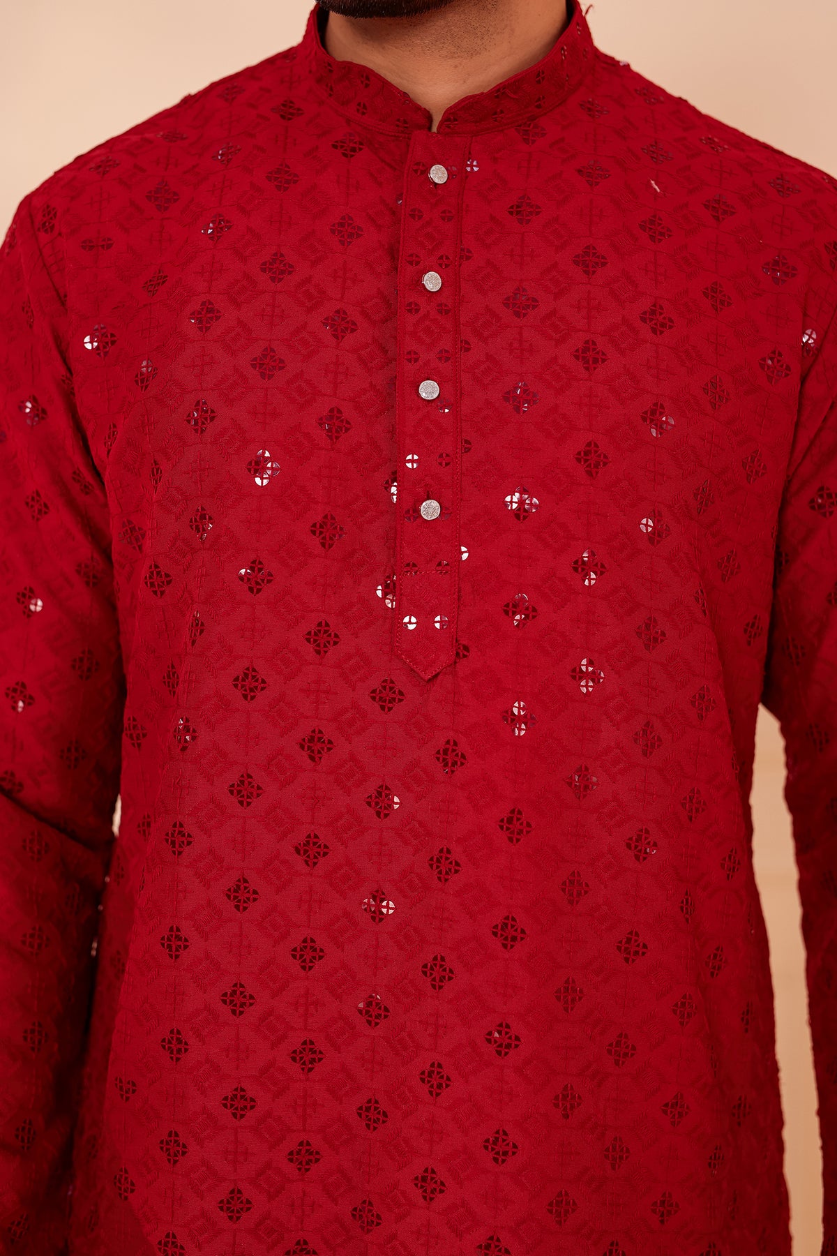Discover timeless elegance in this Maroon Lucknowi chikankari kurta suit, adorned with delicate hand-embroidered detailing and shimmering sequin work throughout. Paired with pristine white bottoms, this versatile ensemble transitions seamlessly from everyday wear to festive celebrations. The intricate craftsmanship of traditional chikankari combined with contemporary sequin embellishment creates a piece that honours heritage whilst offering modern sophistication for any occasion.