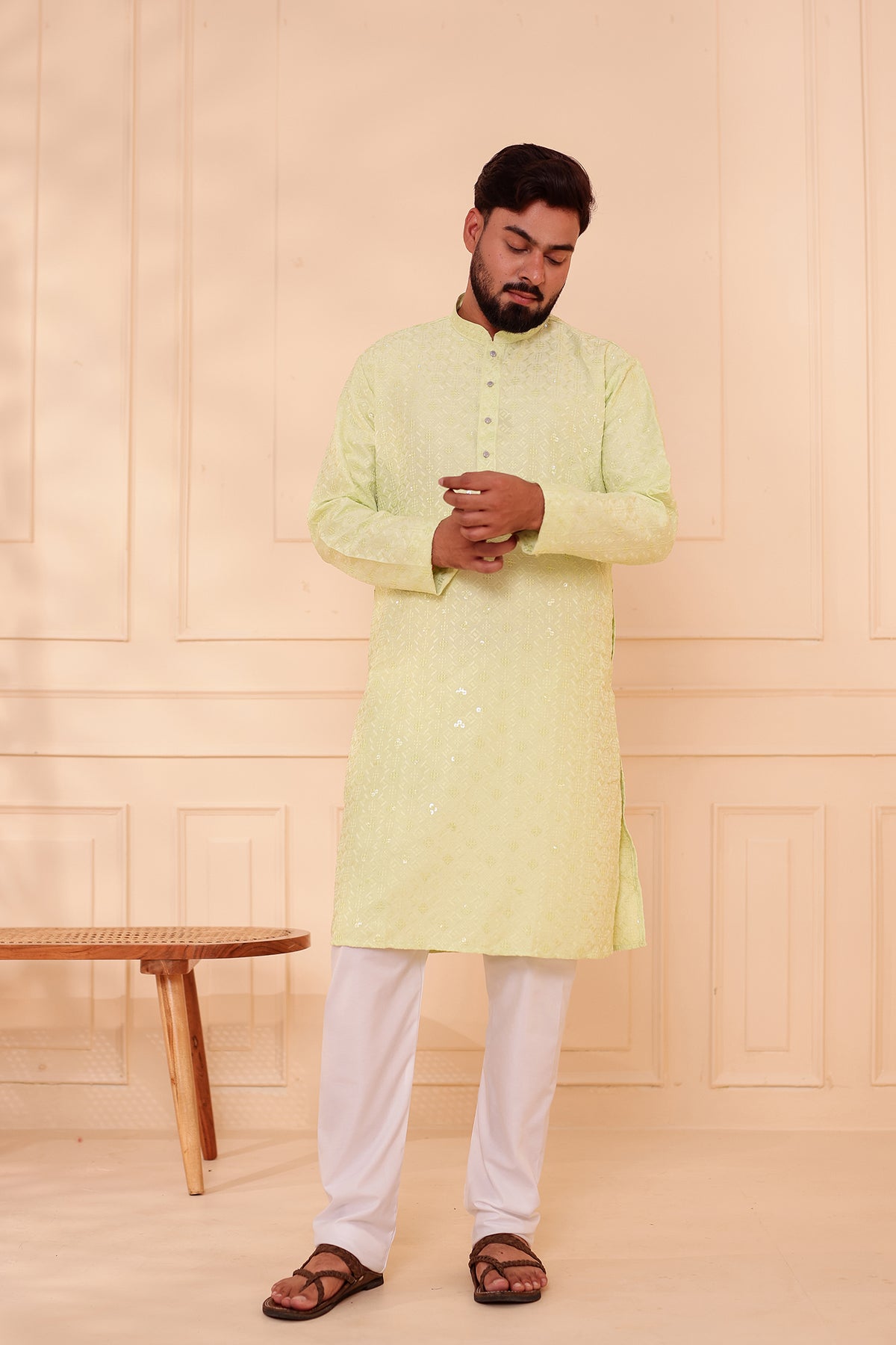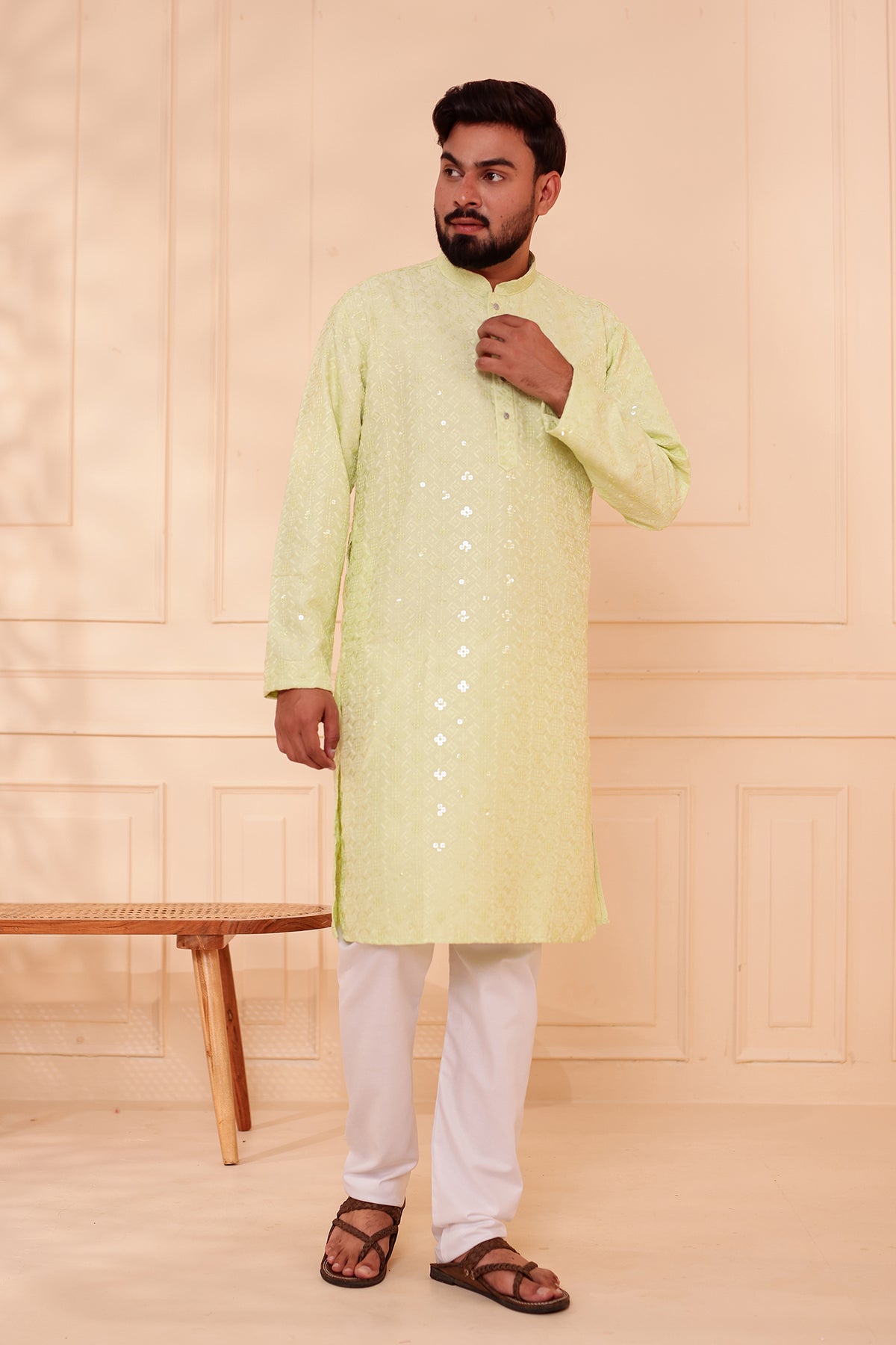 Discover timeless elegance in this Mint Green Lucknowi chikankari kurta suit, adorned with delicate hand-embroidered detailing and shimmering sequin work throughout. Paired with pristine white bottoms, this versatile ensemble transitions seamlessly from everyday wear to festive celebrations. The intricate craftsmanship of traditional chikankari combined with contemporary sequin embellishment creates a piece that honours heritage whilst offering modern sophistication for any occasion.