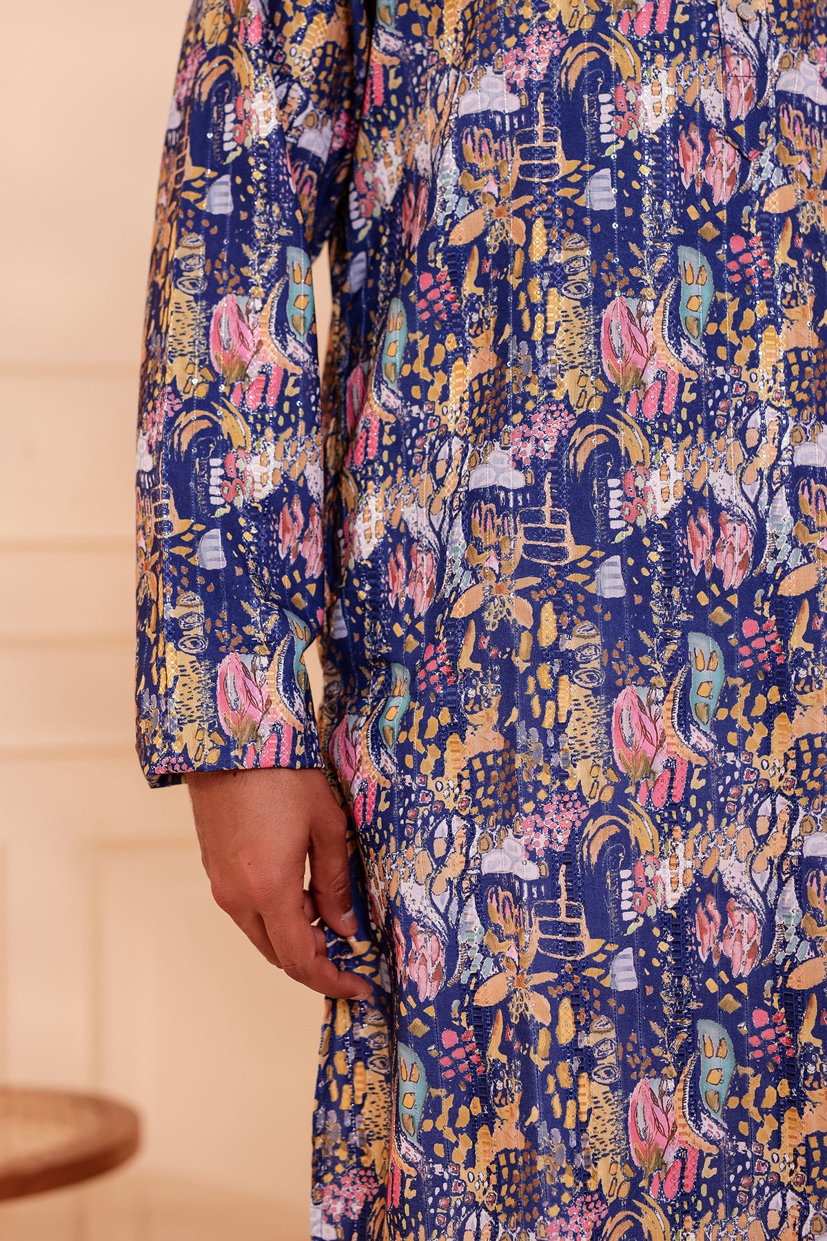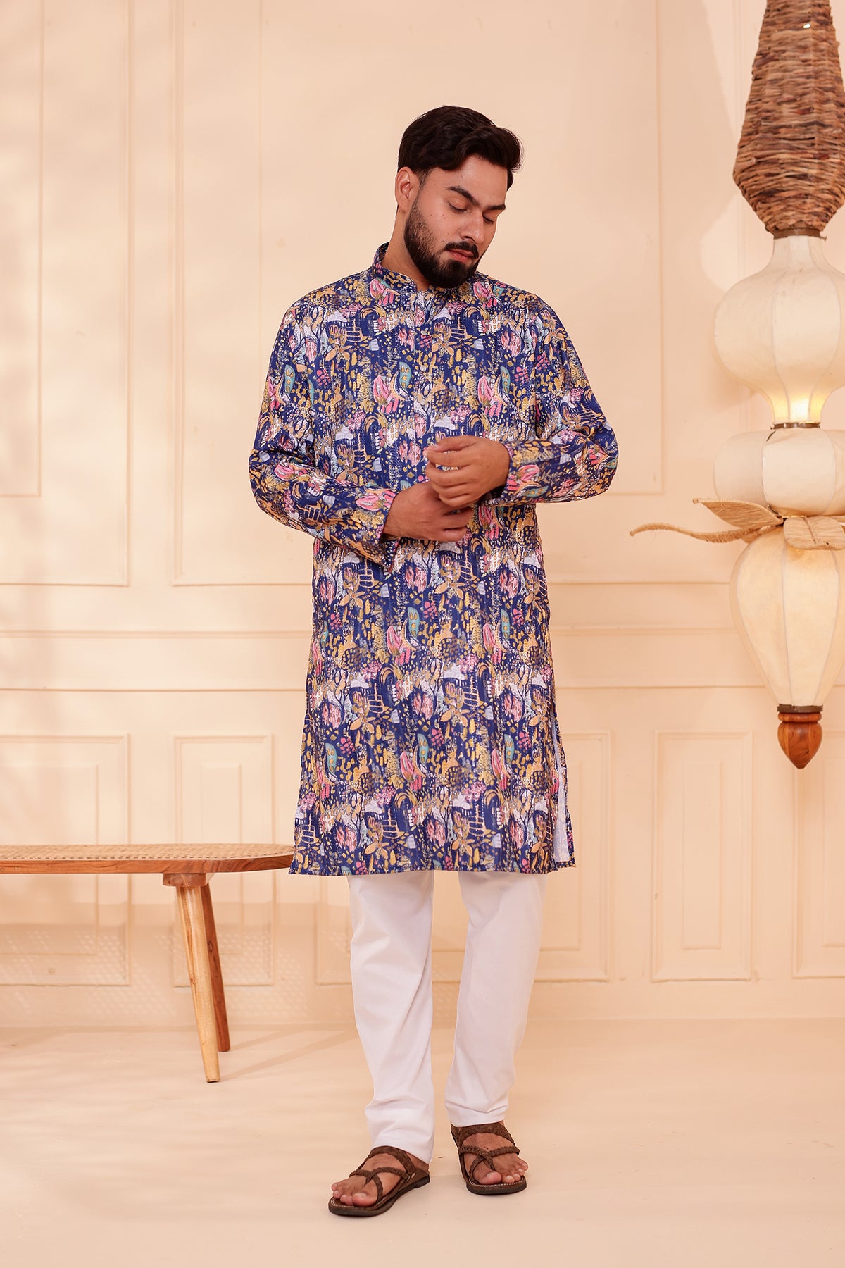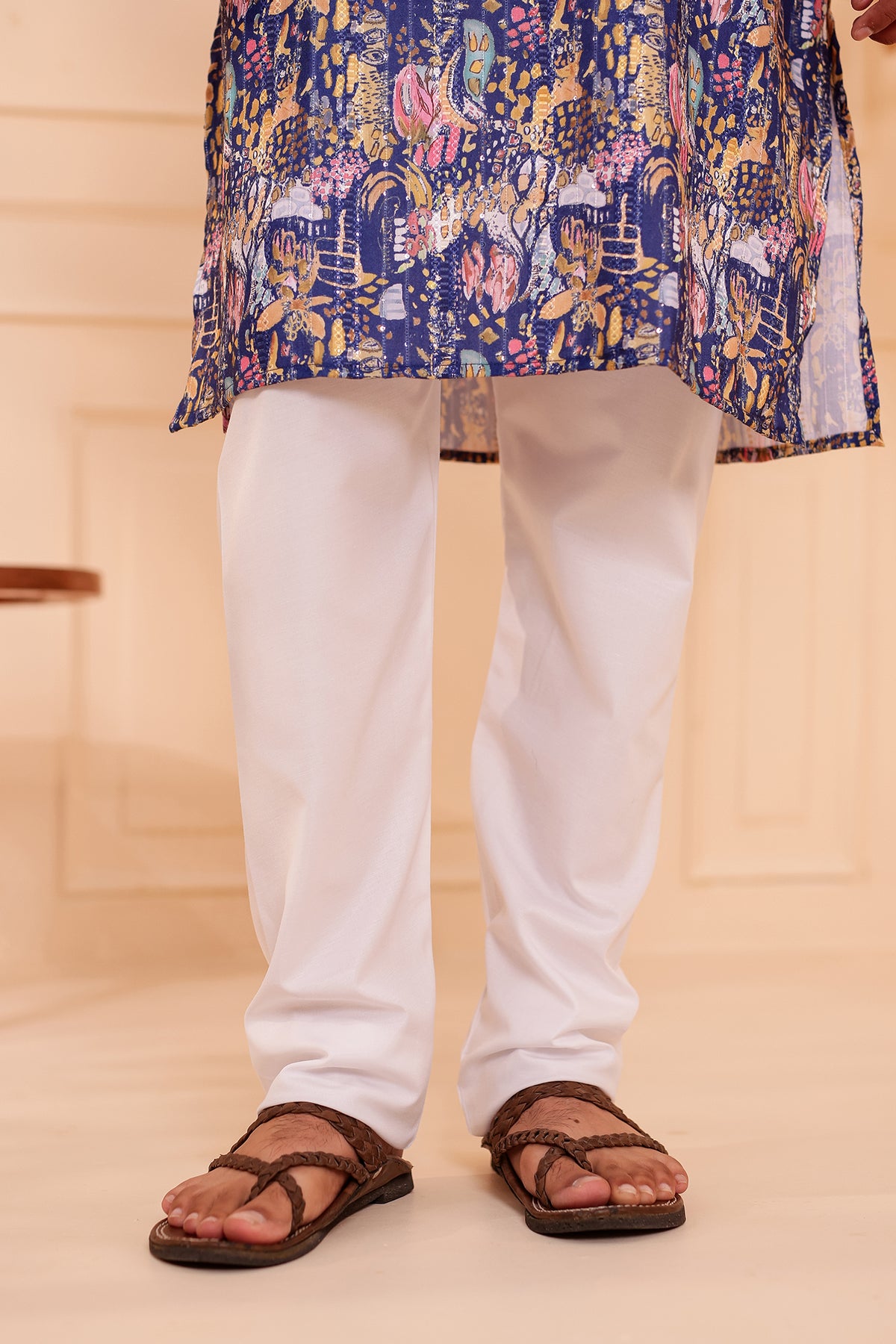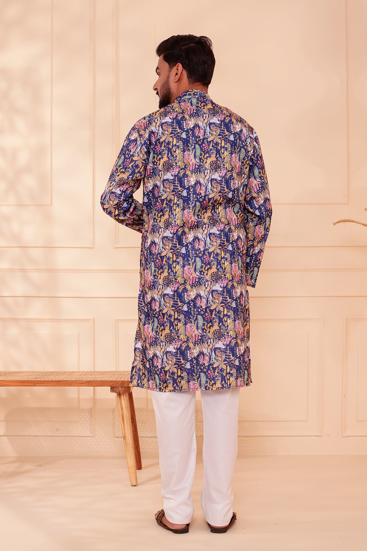 Navy Blue digital print soft silk kurta with all-over thread and sequin detailing, paired with white bottoms. A stylish and elegant set, perfect for every occasion.