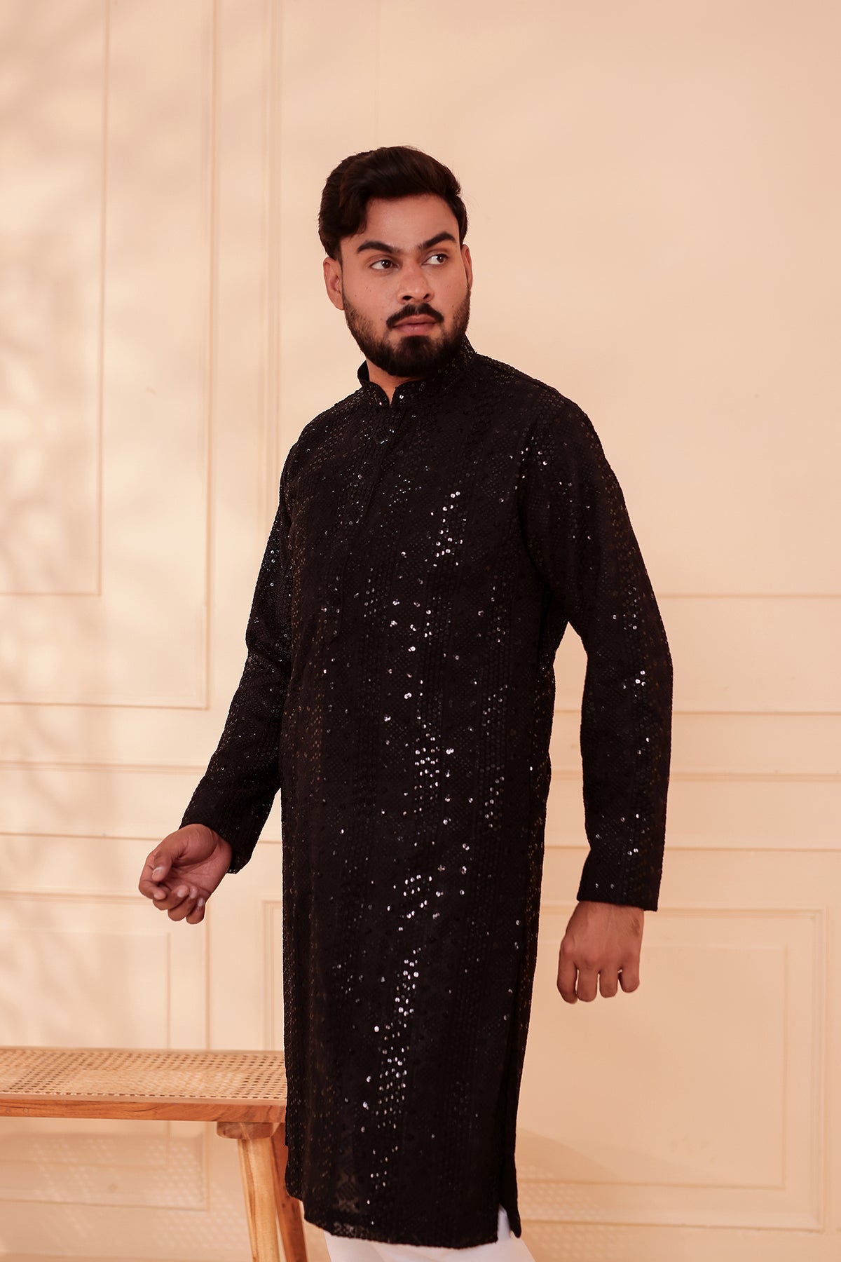 Elegance takes center stage with this black georgette kurta suit, crafted with intricate heavy chikankari detailing. Designed for the modern man who appreciates traditional craftsmanship, this set offers both comfort and sophistication. Perfect for festive gatherings, weddings, or special occasions. Includes a kurta and pajama for a complete ethnic look.