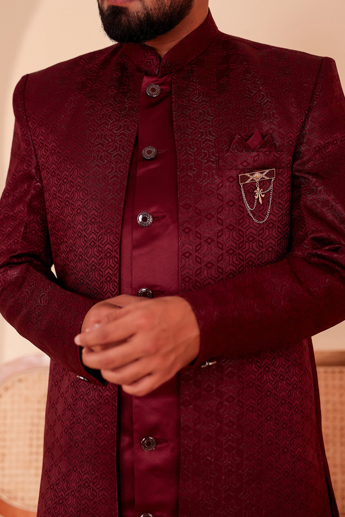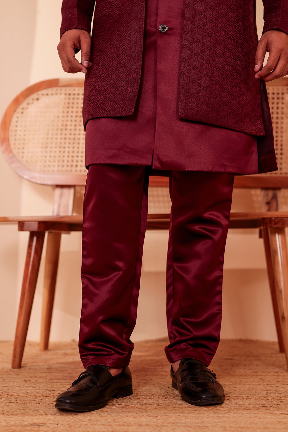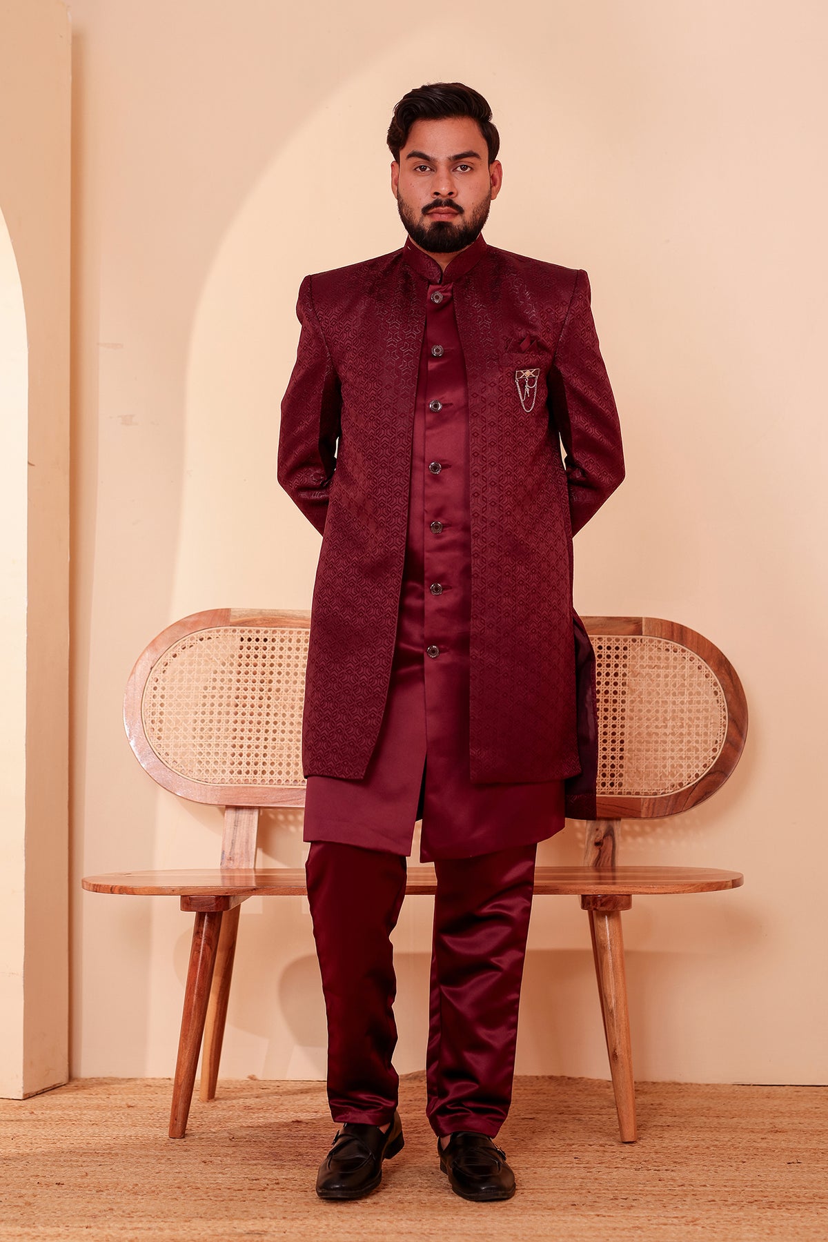 Wine Brocade Silk Jacket Style Indo-western Suit, featuring intricate self-thread embroidery in a sleek jacket style. This ensemble exudes elegance and charm, perfect for formal occasions. Elevate your attire with this fusion of traditional craftsmanship and modern design, making a statement wherever you go.