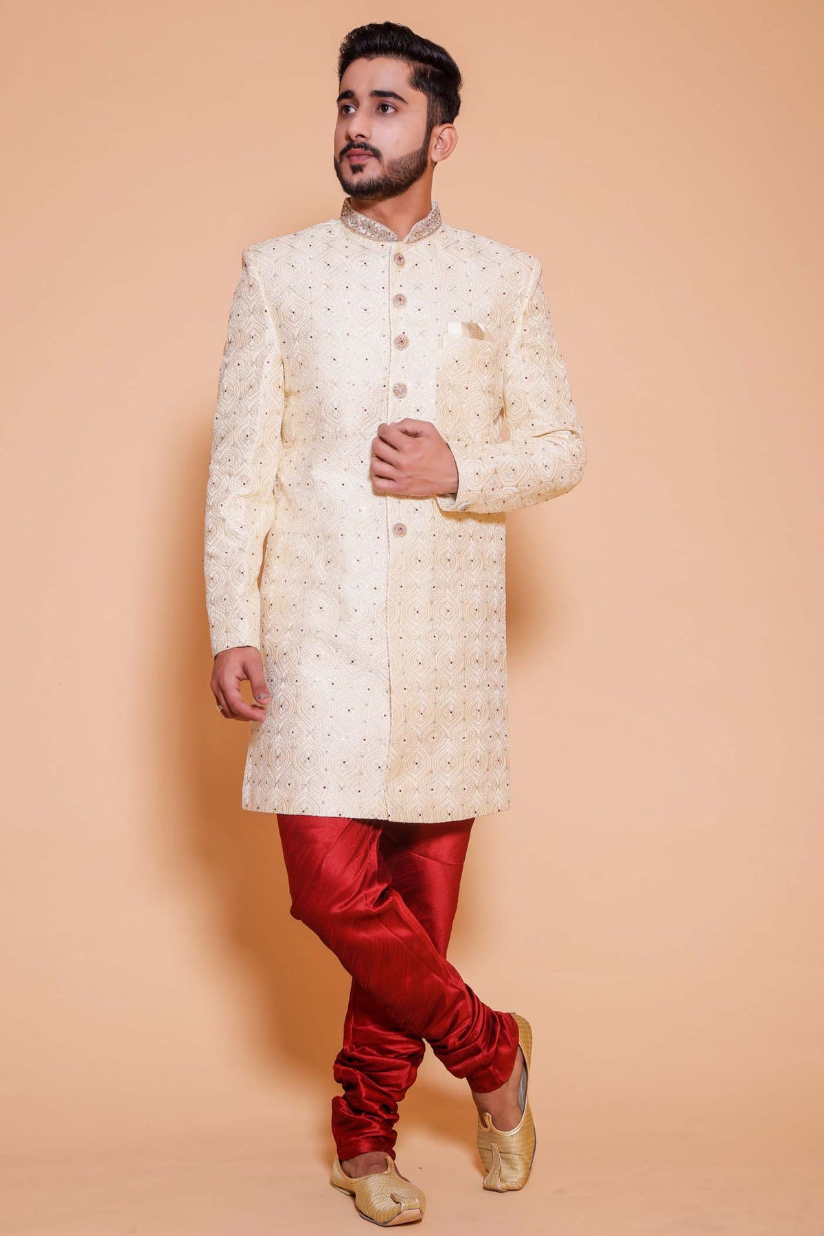 This luxurious Cream Luckhnowi silk Indo-western suit features intricate zardozi, beads, and sequin work on the neckline, adding an exclusive and tasteful touch.